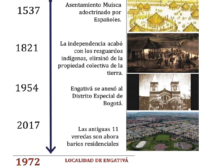 Los procesos de dominación en la colonia sometieron mediante la encomienda a los pobladores indígenas y en 1683 Engativá se eleva como parroquia dando la estocada final en la época republicana que entre 1856 y 1858 elimina el concepto de propiedad comunitaria de la tierra muy característico del resguardo indígena para ser distribuida y repartida de forma individual.